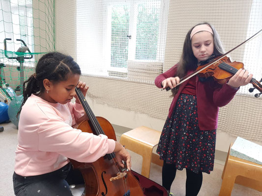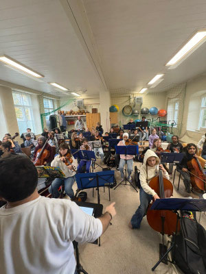 In den Herbstferien ging es für das Musaik-Orchester endlich wieder auf Probenfahrt ins Jugendgästehaus im schönen Pirna-Liebethal. Mit 45 Kindern und sieben Lehrenden waren wir sogar so viele wie noch nie zuvor! Neben vielen Spielen, Spaß und kleinen Ausflügen in die herbstliche Natur der Sächsischen Schweiz standen natürlich das Üben und das Proben unserer aktuellen Stücke im Vordergrund. Für die Kleinsten bedeutete das zum Beispiel, erstmals das Notenlesen spielerisch zu lernen. Um sie dabei bestmöglich zu unterstützen, haben wir uns etwas Besonderes ausgedacht: die Übe-Patenschaften! Ein am Instrument fortgeschrittenes Kind durfte dabei einem Anfänger oder einer Anfängerin zur Seite stehen. Wir sind ganz stolz auf unsere Übe-Paten und konnten unmittelbar miterleben, wie Selbstwirksamkeit und Fortschritt am eigenen Instrument Hand in Hand gegangen sind. In Konsequenz wurde sogar das Dirigieren zeitnah von Kindern übernommen.