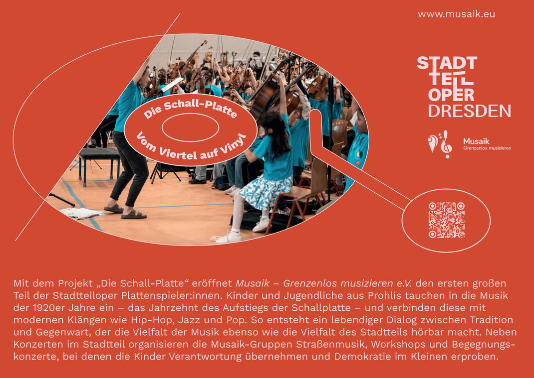 Die bereits bestehenden Musaik-Gruppen aus dem letzten Schuljahr präsentieren sich in einer Reihe kleiner Konzerte, unter anderem am 30.08.25 beim Interkulturellen Bürgerfest Prohlis, am 18.09.25 an der Neuen Waldorfschule Dresden, am 27.09.25 in der Zentralbibliothek im Kulturpalast, am 01.10.25 bei einem Begegnungskonzert im Heinrich-Schütz-Konservatorium und am 12.10.25 beim Abschluss der Interkulturellen Tage Dresden im Bürgerhaus Prohlis. Ein besonderes Highlight bildet die Straßenmusik-Aktion der „Dunkelblauen Gruppe“ am 27.09.25: Die Kinder organisieren ihre eigene kleine Tour durch die Dresdner Innenstadt. Ergänzt wird das Projekt durch die Zusammenarbeit mit der inklusiven Hip-Hop-Tanzgruppe „KnäckePROHt“.
